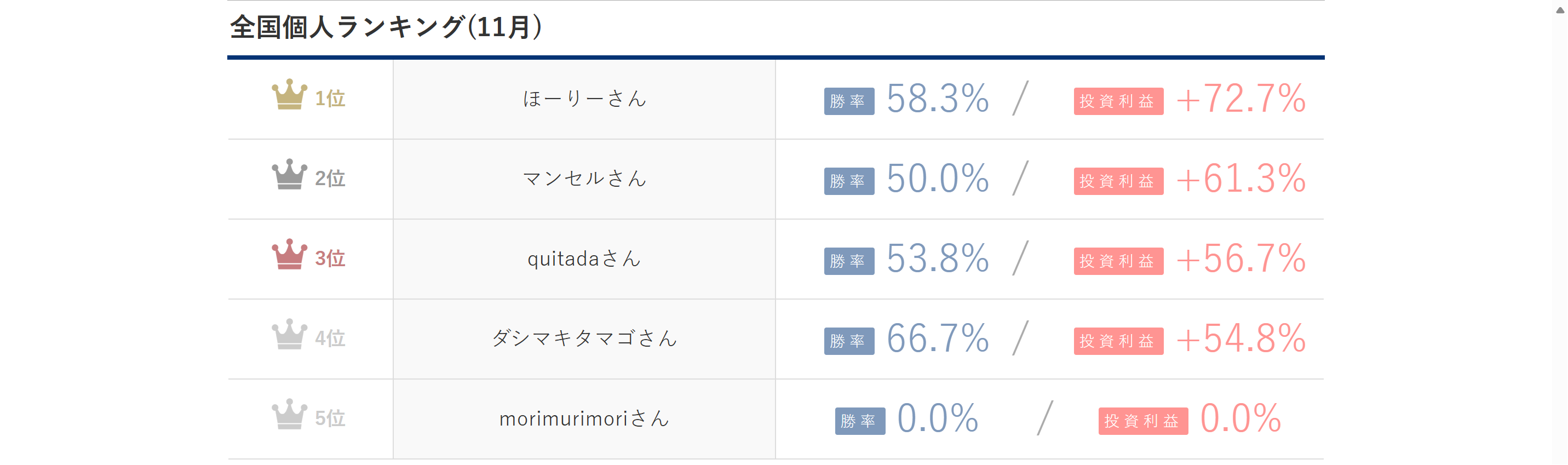 【月間投資利益ランキング】2025年11月トップはほーりーさん【+72.7%】