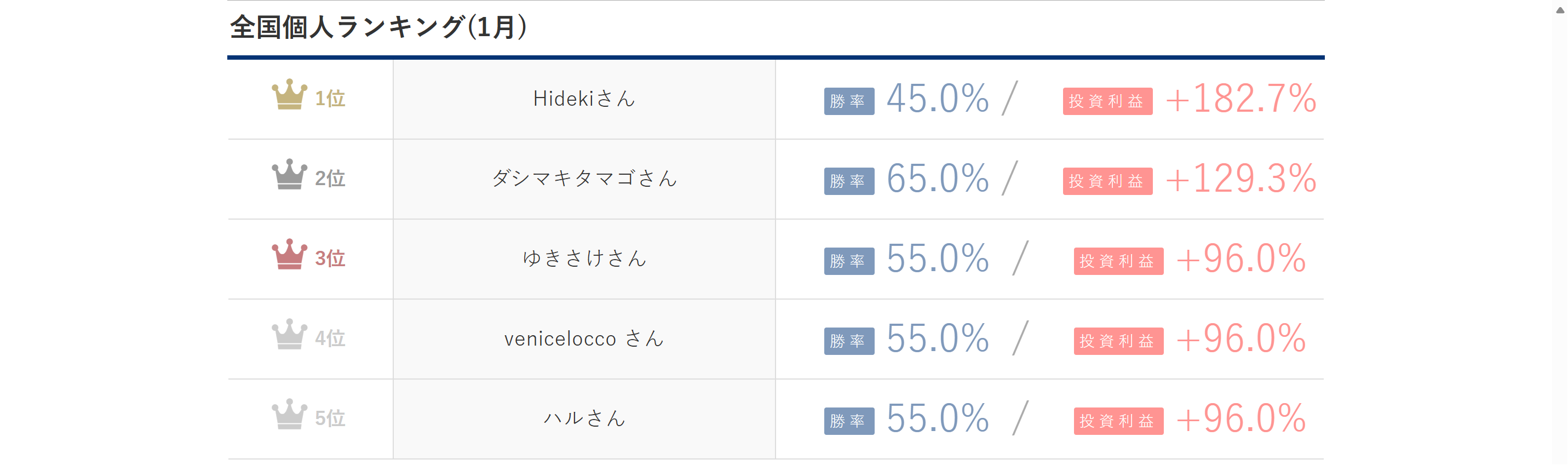 【月間投資利益ランキング】2026年1月トップはHidekiさん【+182.7%】